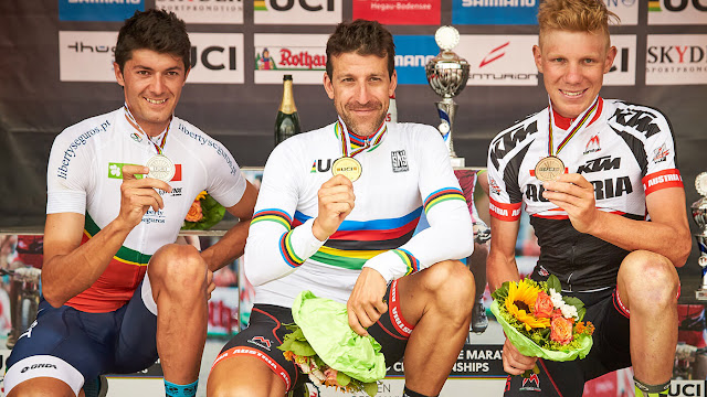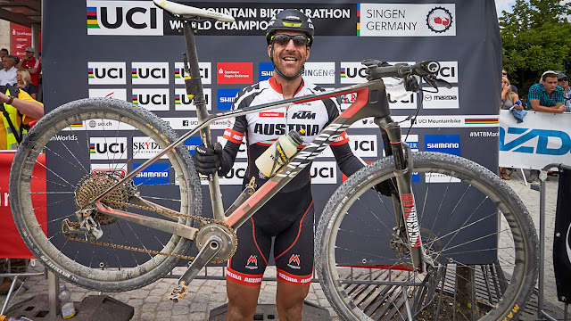 At the right moment, Alban Lakata wrung out every remaining once of energy from his body and sprinted on his Canyon Exceed with special worldcup design to the finish line. Ferreira had no chance of getting out in front of Lakata, nor did Geismayr. "Incredible, my third rainbow jersey, that’s a dream. I am so happy", as he let his feelings in front of the camera run free. "And today will be celebrated, you can believe me." The third world cup title, the seventh world cup medal overall and the 38th birthday just to cap it off.