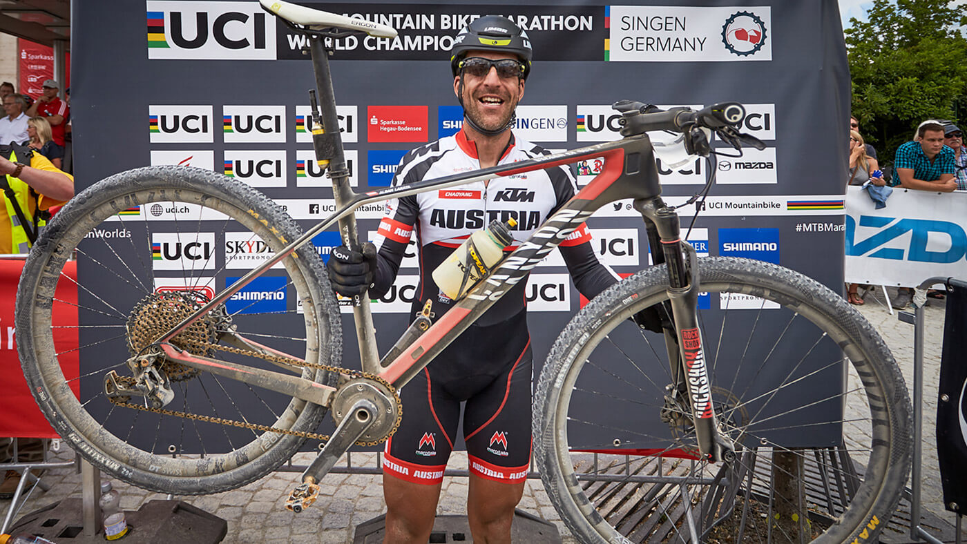 Topeak Ergon Racing Team (Germany) – Third Gold for Alban. The “Albanator” has done it once again. At the UCI Marathon World Championships in Singen/Germany, Alban Lakata takes home his third rainbow jersey on his 38th birthday. The over-joyous East Tyrolean beats title defender Tiago Ferreira in a dramatic sprint.