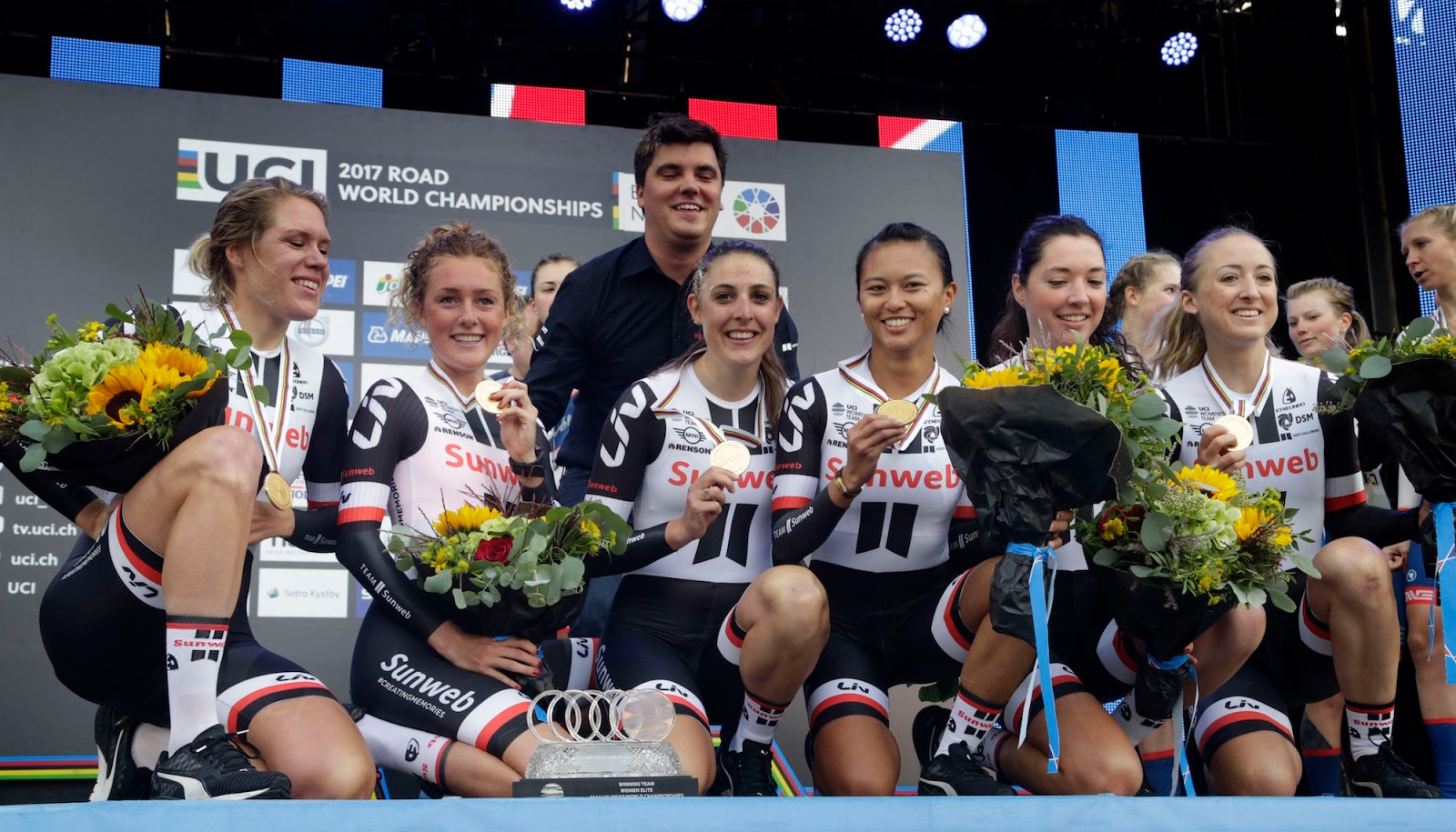 Team Sunweb, formed of Lucinda Brand, Leah Kirchmann, Floortje Mackaij, Coryn Rivera, Sabrina Stultiens and Ellen Van Dijk, crowned Women’s Team Time Trial World Champions.