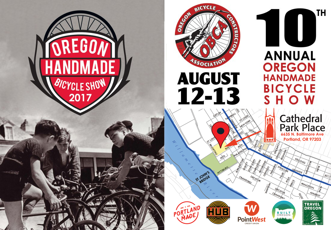 The Oregon Bicycle Constructors Association, a 501 (C) (6) non profit trade association, is hosting the 10th Annual Oregon Handmade Bike Show at their new home in the historic Cathedral Park Place complex in the shadow of Portland's historic St. John's Bridge, August 12/13.