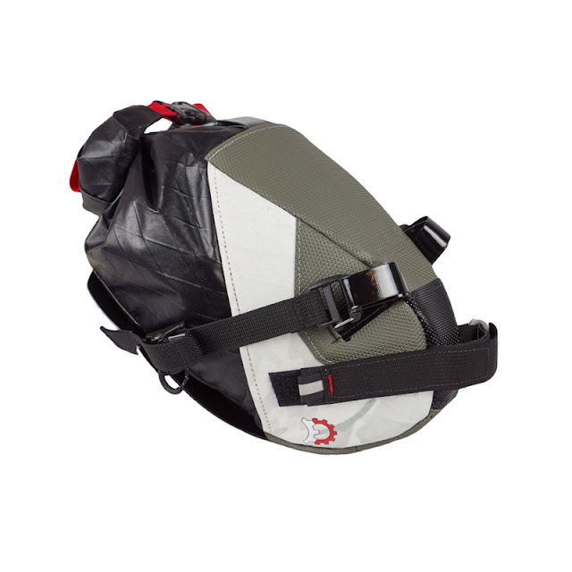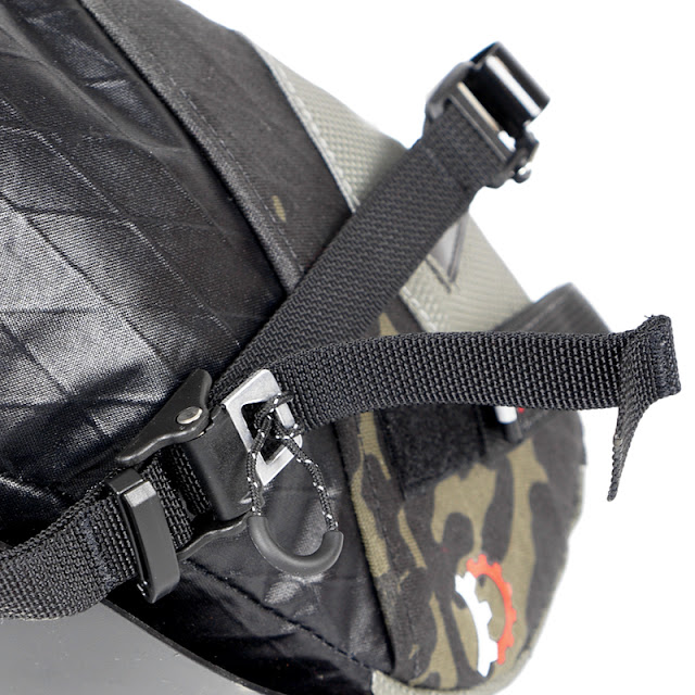 A key feature is our Indie-Rail attachment system. This a progression from conventional bikepacking bag mounts where the rail straps are fixed to the top-center of the bag. With Indie-rail, each rail is cinched down to the sides of the bag greatly reducing bag sway without any additional hardware. We combine this with a rigid internal structure and active camming buckles to prevent straps from loosening and slipping on rough terrain or wet conditions.