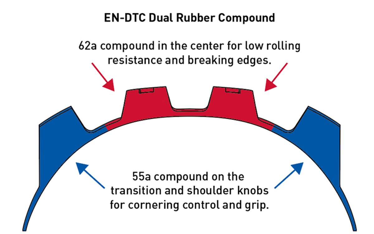 “Designed around the rigors of enduro racing. Featuring a lower rolling resistance value than previous dual tread compounds, tires with EN-DTC show less wear than other similar tires. With shore A values lower than the original DTC, the EN-DTC provides a more responsive ride, letting the knobs do the work of control and braking on the ground”, concluded Kenda.