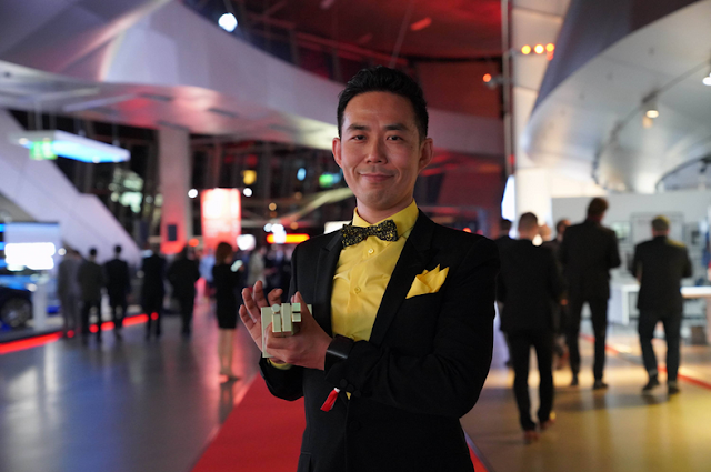 iF Gold Award Trophy with LEOMO, Inc. CEO Kunihiko Kaji.