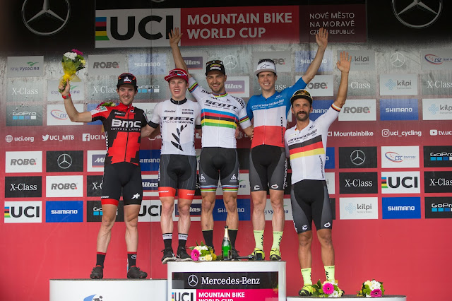 The Top 5 of the World Cup Podium in Nove Mesto- N1NO Schurter (1st), Anton Cooper (2nd), Maxime Marotte (3rd), Lars Forster (4th), Manuel Fumic (5th).