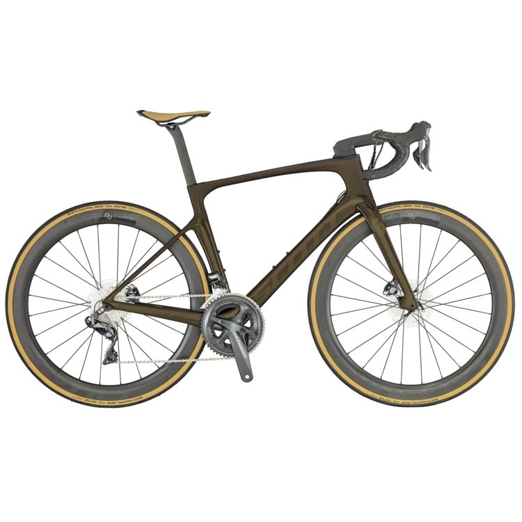 The dark bronze color used for our 2019 Scott Addict RC Premium disc is a good example of our new approach: the deep metallic color combined with reduced graphics gives the frame a unique look. The light brown Syncros leather saddle and matching skin wall tires make it an outstanding bike.