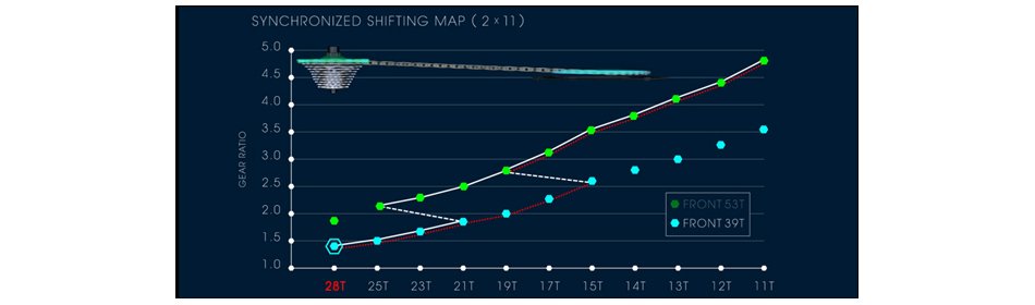 Shifting the rear derailleur from 11T towards 28T, the system recognizes the preferred gear ratio step should be made between the 25T and 21T sprocket.