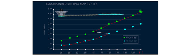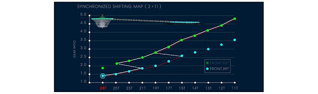 Shifting the rear derailleur from 28T towards 11T, the system recognizes the preferred gear ratio step should be made between the 15T and 17T sprocket.