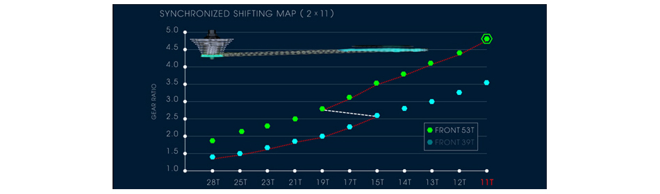 A function that allows riders to concentrate on only up or down shifting the rear derailleur while the Di2 system automatically picks the right gear combination from both the front and the rear derailleur. Even in Synchronized Shift mode riders still have full control over the front derailleur. Synchronized Shifting is designed to complement rather than replace manual shifting, and is especially useful when you are using auxiliary sprint, climbing or TT shifters, or, for Dura-Ace, the shifters on the top of the hoods.