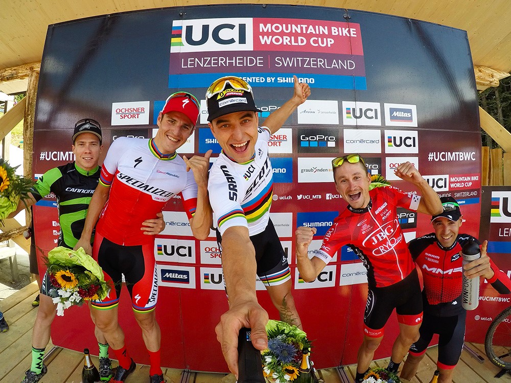 The podium in Lenzerheide: Maxime Marotte (4th), Jaroslav Kulhavy (2nd), Nino Schurter (1st), Anton Sintsov (3rd), David Valero Serrano (5th).