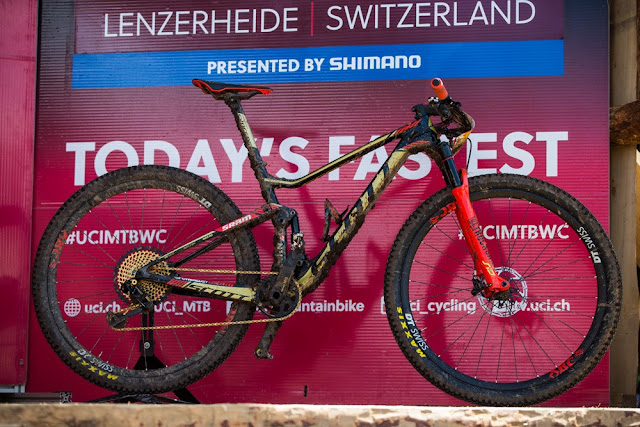 SCOTT-SRAM MTB Racing Team chose the 100% race dedicated RC 900 World Cup version. "Its frame is the lightest full suspension race bike to date and packed with top-of-the-line specs", stated Scott. In Lenzerheide, winner Nino Schurter raced a special edition, the "GOLD Edition". SCOTT honored the Olympic Gold medalist and designed a frame which not only shines bright in golden colors but also lists some of Nino`s greatest victories.