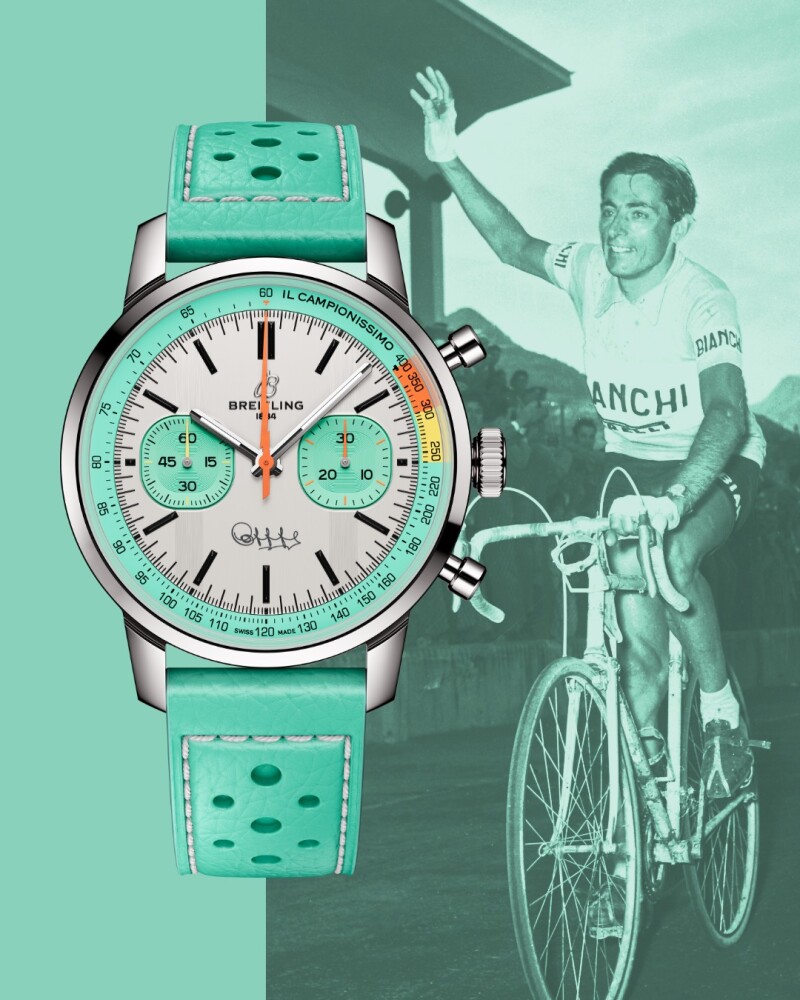 Breitling (Switzerland) - Press Release: Fausto Coppi and Gino Bartali united a nation through their professional rivalry and extraordinary real-life friendship. Now, Breitling unveils two vibrant limited-edition chronographs dedicated to the Italian cyclists’ legacy of resilience and achievement.