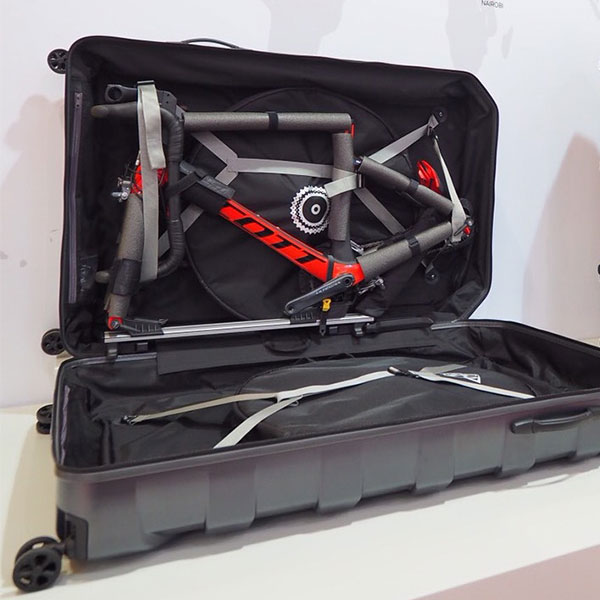 Topeak (Germany) – For 2018, Topeak has unveiled the PakGo X bike case (for 650c and 700c road and TT bikes) at the Eurobike Show in Friedrichshafen, Germany. The PakGo X bike case, expected to be available to consumers in late January of 2018, boasts its upright design which allows luggage-like ease for rolling when traveling, includes a built-in TSA lock, carrying handles, and four large multi-directional wheels, making the case incredibly mobile with little effort.