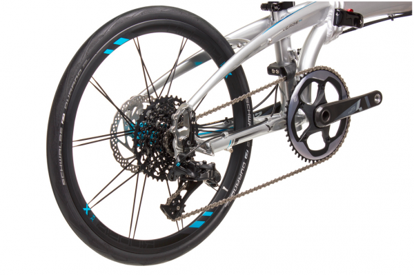 Tern’s new Verge bikes begin with 451 mm wheels, which offer 10% higher gearing than 406 mm wheels. That means the bikes achieve downhill gearing - up to 102 gear inches on the Verge X11 - using standard equipment. Since they’re larger, 451 tires carry more momentum and deliver more comfort than 406, yet they’re small enough for convenient portability, punchy acceleration, and nimble handling. “Good design is always a game of optimization,” says Joakim Uimonen, Design Director of Tern. “Consumers traditionally believe that total folded size is equivalent to wheel size. One of the key insights with our 451 bikes is that although the folded package gains an inch at the wheels, size is saved at the chainring. Overall, it’s an even trade-off in size, but a huge boost for performance.”