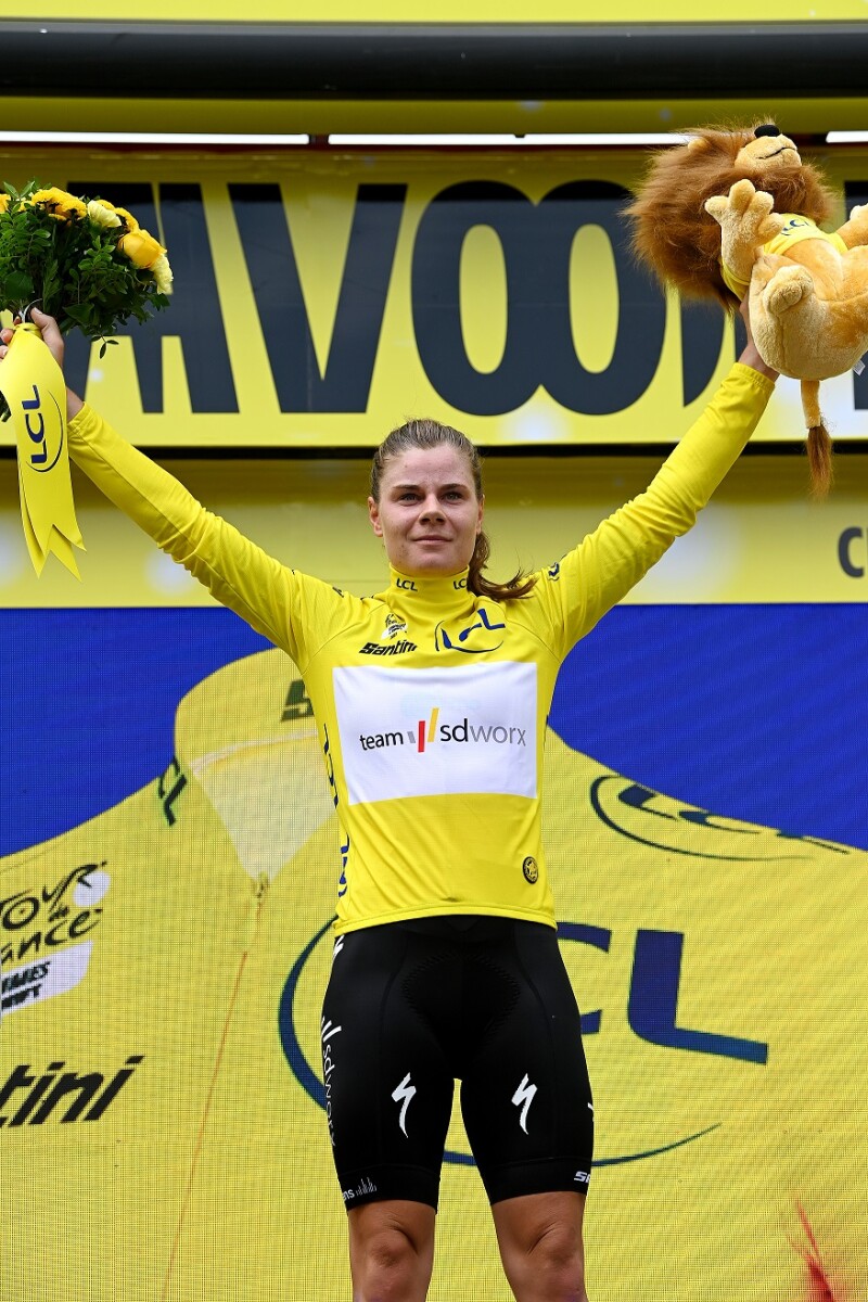 Team SD Worx is having a dream start in the Tour de France Femmes. The Dutch WorldTeam immediately made the most of its strength in width in the first stage. On the Côte de Durtol at 9.4 kilometres from the finish, Lotte Kopecky placed a scorching acceleration to which nobody had an answer. The Belgian then soloed to victory and the accompanying yellow jersey, before Lorena Wiebes also sprinted to second place.