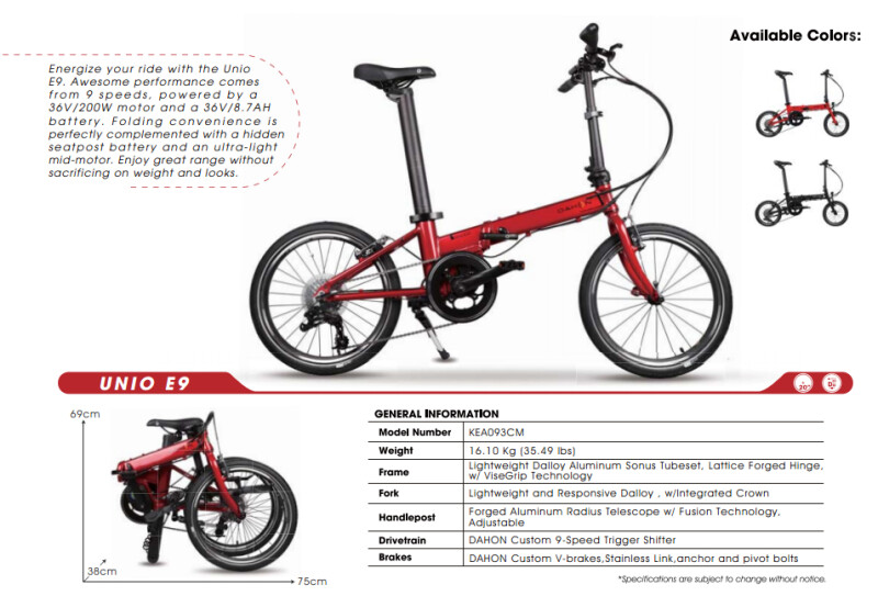 DAHON North America Inc. (United States) - Press Release: After the announcement of their pandemic special edition bike HIT, earlier in 2021, folding bike pioneer DAHON has added another new folder to their innovative line up, electric model Unio E9.