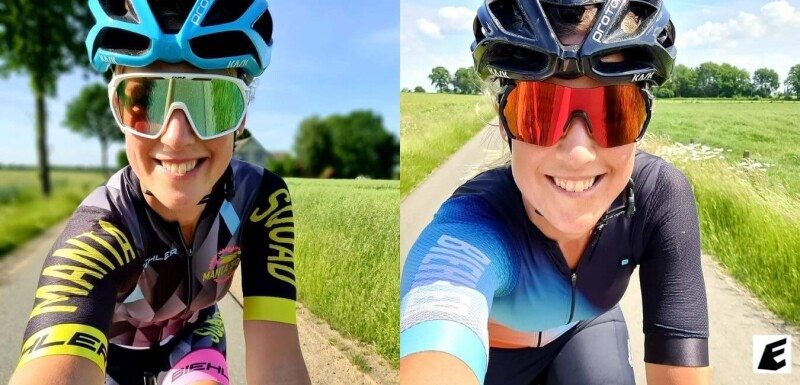 Stephanie Esspunkt is shown below wearing the EASSUN Paradiso cycling sunglasses, on the left, and the EASSUN Veleta cycling sunglasses, on the right. Both models feature anti-fog and water-repellent sunglass lenses and unique features for excellent comfort.