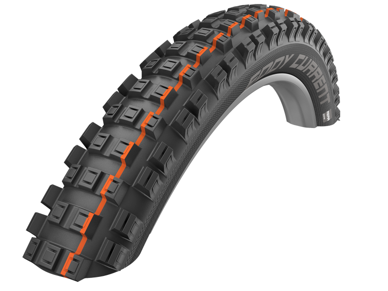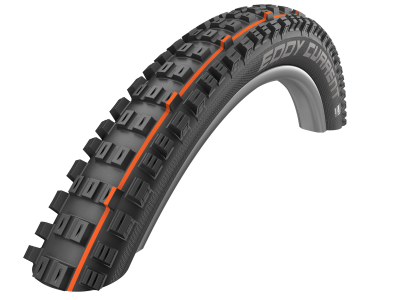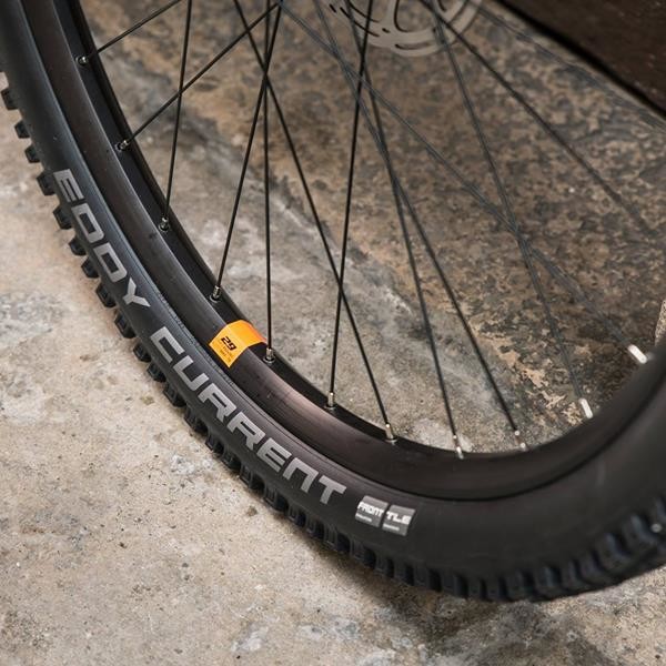 Schwalbe equips Eddy Current with its most sturdy carcass. Five layers of fabric on the tread and four on the side wall reliably protect against punctures and snake bites. They won’t let their riders down even on extreme descents. An Apex and the SnakeSkin side wall provide additional protection. The tire is also Tubeless Easy. And: as its tread is not directional, it doesn’t matter which mounting direction you choose – a great relief in these Tubeless times.