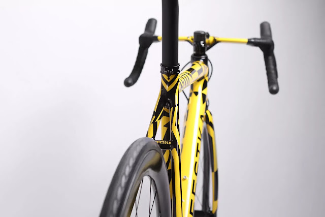 We picked Dazzle because that specific design shows the impeccable skills of our varnish master. The background story of the Dazzle design goes back to the camouflage of war ships and that is another parallel with the race. It is yellow because yellow is the jersey colour of the winner and when you dream of Tour de France you dream of winning it, right? You simply have to fight your way through the steep climbs of the French roads. Spectre is a symbol of the race and it is also its perfect companion.