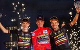 Sepp Kuss crosses the line with his teammates and celebrates his first Grand Tour victory after being a key domestique in Jumbo-Visma’s previous successes.