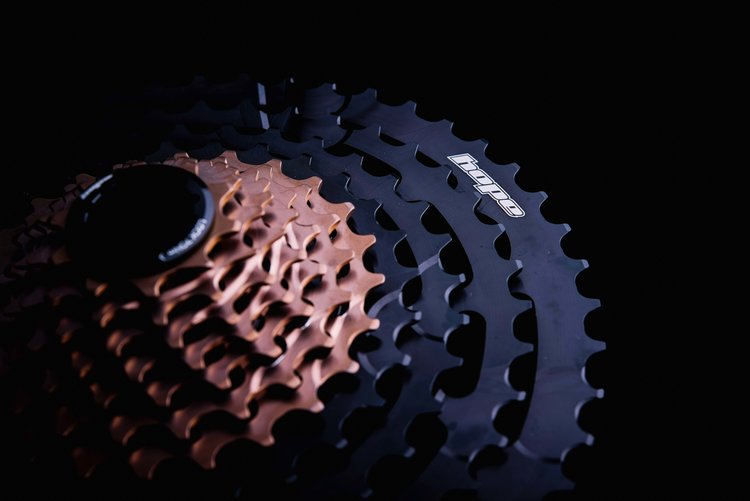 One of Hope's “long term” development projects, the rear cassette went through many stages during its evolution. They gradually “tweaked” the tooth profile and ramps to give the perfect shifting both up and down the gears. The final design uses 7 sprockets, 10t-24t, machined from a single stainless steel billet that is heat treated. Then four larger sprockets, 28t-44t that are again machined from a single billet, although this time it’s aluminium that is hard anodised. The cassette fits onto a specially made freehub that is machined slightly shorter to accommodate the 10t sprocket.