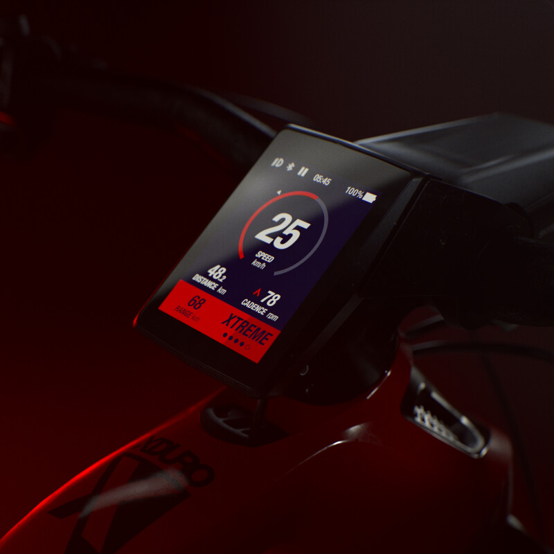 The colour display centrally positioned above the stem is easy to read in every situation due to the transflective design. Current riding data and system information are displayed on four changeable screens. It is also possible to display and analyse training-relevant data such as pulse measurement, cadence or calorie consumption.