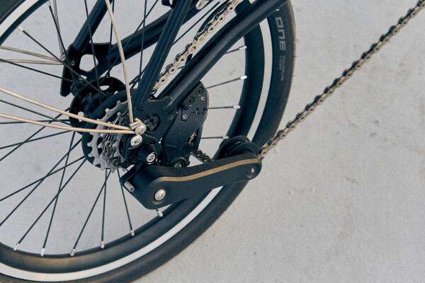 Designed in-house, the new superlight compact gearing system is fine-tuned for city riding. The 4-speed system with an all-new 60-gram derailleur is meticulously engineered to fit inside the narrow fold. Delivering a similar ratio to the 3-speed and 60% more than the 2.