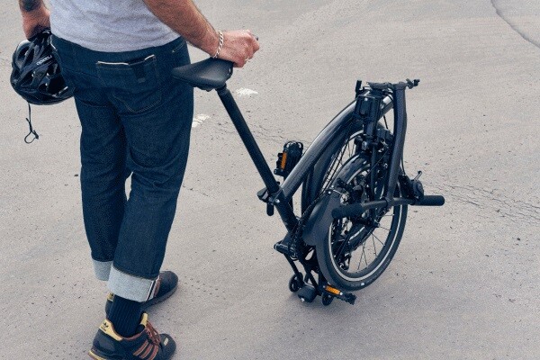 Moving with this bike is easy. Our new dual-locking seat post system has two positions, fully down for storing or halfway up for rolling. The folded bike gently steers through tight busy spaces with the Superlight Saddle nose handle. Larger, lighter rolling wheels glide over uneven ground.