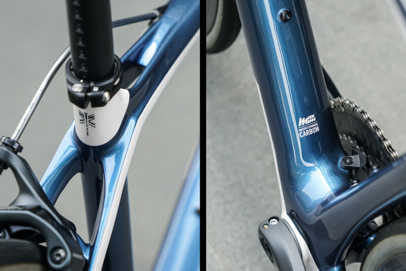 An ice-white band runs from the seat stays to the top tube, and back down to the chainstays, creating a sense of fluidity and highlighting the MR1s’ unique CCF tube design for optimizing riding comfort.