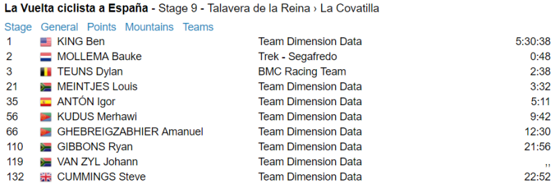 Team Dimension Data (Spain) - Ben King won his second stage of La Vuelta for Team Dimension Data and rode incredibly to cross the line ahead of Bauke Mollema (Trek-Segafredo). Third spot was filled by Dylan Teuns (BMC Racing Team).