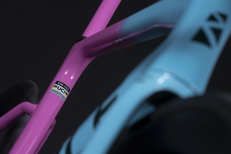 The livery is bright and bold, designed to match the dynamic personality and exuberance of the team on and off the bike. The frame is finished in the Team colours of ‘Clear Skies’ Blue fading into ‘Radish Blossoms’ Pink with accents of “Evergreen” and is adorned with the iconic Team motto #ColourTheRoad as a graphic detail on the top tube.