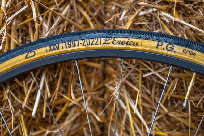 L’Eroica has teamed up with Vittoria – already partner of L’Eroica events all around the world – to create a one-of-a-kind, limited-edition tubular to celebrate its 25th anniversary. The limited-edition tubular for L’Eroica XXV anniversary is available in 25 mm width to offer extra comfort and lower rolling resistance.