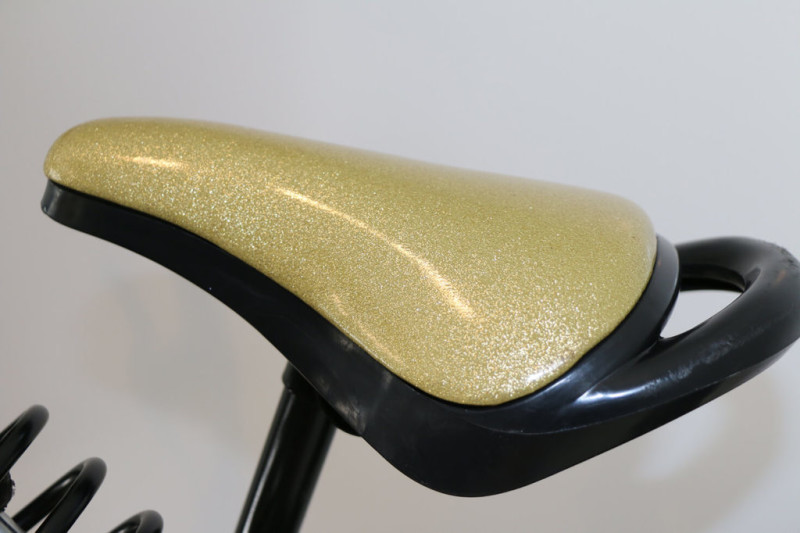 According to Moos, the initial design concept was to produce a “Dyna-bro Strider.” The crew completely tore down the little bike to its individual components and cut all unnecessary pieces from the frame. They used a gold Legends shock, which set the color scheme, then they determined the new ride height and angle of the swing arm. One crew member decided it would be great to mount the shock in the same fashion as the Indian Scout that Krystal rides.