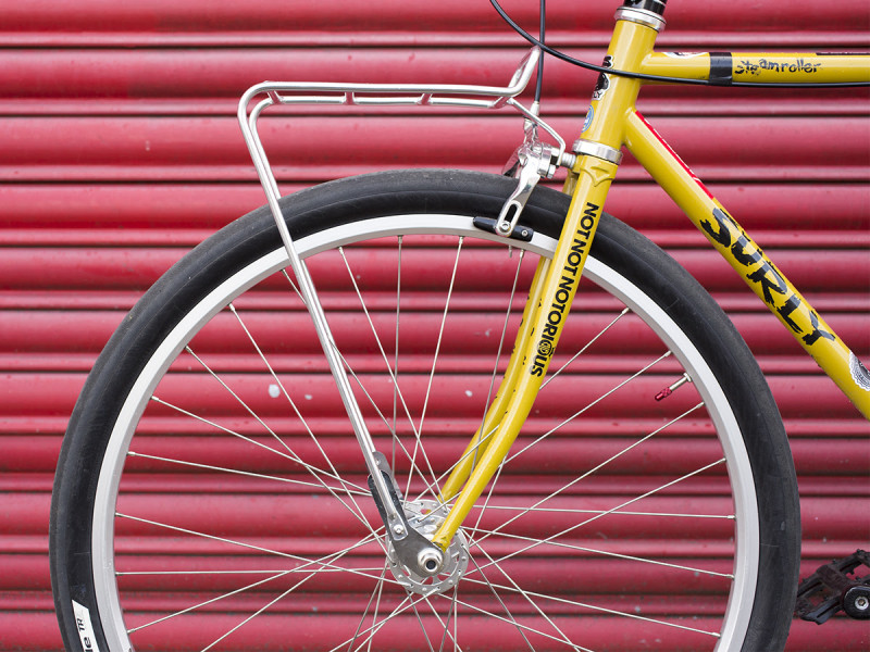 The rack comes with fittings for standard mudguard eyelets, but can be fitted on the wheel axle too, using our BLB Universal Adjustable wheel bracket – as shown on Andrea’s Surly commuter.