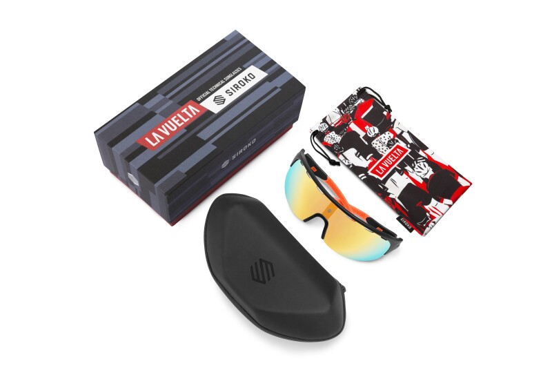 Siroko Tech (Spain) - We celebrate an event like La Vuelta with a unique model. An exclusive design, extraordinarily cutting-edge and with a performance that meets the highest demands. Ultra-light transparent PC frame (only weighs 27g). Special TAC 1.2mm polarized interchangeable panoramic lens with anti-fog film and REVO cover. DrySky system perfected to make sure they never fog up. Includes: limited edition La Vuelta 20 packaging, hard polyurethane case, microfiber bag and replacement pieces for nose pad and temple. Available accessories: photochromic, anti-fog and clear lenses as well as TR90 optical clip.