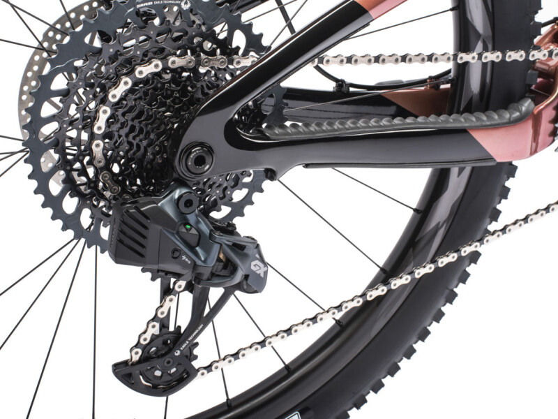 This bike includes; RockShox's Flight Attendant, an auto suspension system comprised of the Lyrik Ultimate Flight Attendant fork, Super Deluxe Ultimate Flight Attendant shock, and SRAM's XO1 Flight Attendant crankset, with the addition of SRAM GX Eagle AXS wireless drivetrain shifting to complete the package.