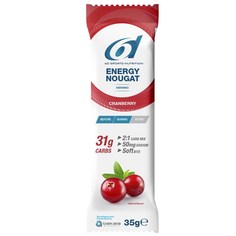 6d ENERGY NOUGAT has a low protein and fiber content with a moderate fat content, and is therefore an easily digestible, carbohydrate-rich bar. Thanks to its soft texture, this compact energy source is very easy to chew, even in cold weather. This makes the 6d ENERGY NOUGAT an excellent option to use just before exercise, and/or to alternate with other energy bars and gels during exercise. One bar contains 31 g of carbohydrates in a 2:1 glucose to fructose ratio. Thanks to this 2:1 ratio the body can absorb up to 90 g of carbohydrates per hour. In contrast to most other “energy bars”, the 6d ENERGY NOUGAT also contains 50 mg of sodium. The addition of sodium allows for a quick replenishment of the salt reserves in the body. This is particularly important for athletes who not only sweat a lot, but also sweat out lots of salts (“salty sweaters”), and especially during exercise in a hot environment that causes high sweat losses. In such conditions, our 6d ENERGY FRUIT or 6d ENERGY CAKE might be a better option due to a higher sodium content, which is 100 mg and 141 mg respectively.