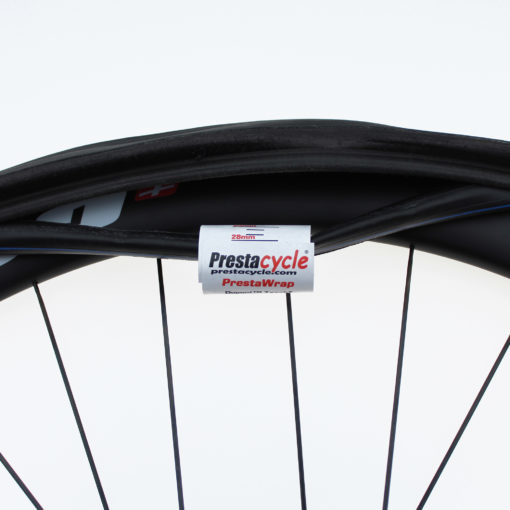 To apply the tire boot, simply pull-out the tube from underneath the tire at the location of the cut in the tire. Remove the backing to expose the adhesive, and wrap it around the tube with the printing facing outward. You will be sticking the PrestaWrap to itself, NOT to the tube or tire. Use the size of your tire as the guide for sticking the boot into cylinder shape. Example: If your tire size is 700x28c, then stick the top edge of the boot at the line under 28mm. Re-install the tube and make sure the PrestaWrap is centered underneath the cut. Since PrestaWrap only sticks to itself, it can be easily moved and positioned.
