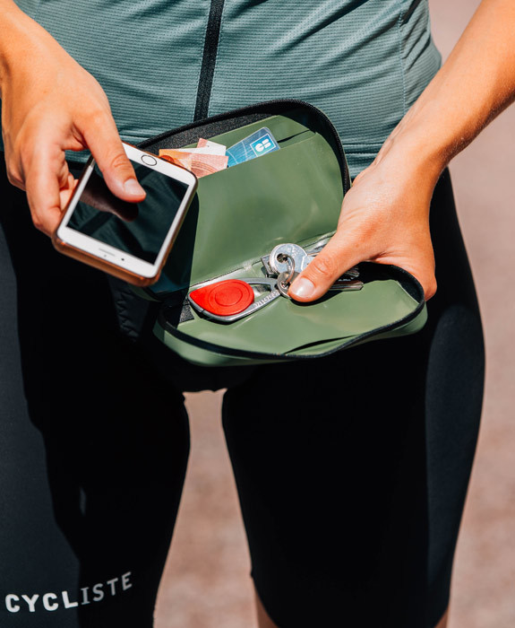 The pouch has one main compartment and two inner side pockets, making it perfect for phones, keys, credit cards and other valuables. It is equally suited to spare tubes and a multi-tool, creating a repair kit that fits easily into a jersey pocket.