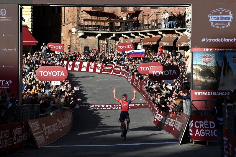 Tom Pidcock claimed a rousing solo victory at Strade Bianche following a gutsy attacking ride of over 50 kilometres.