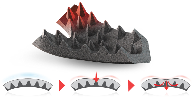 When a shock occurs, the impact force is directed towards the head pushing the outer layer to compress. Simultaneously, the head presses in the opposite direction compressing the inner layer and the hexagons. In this way, energy is spread within the foam instead of towards the head and, thanks to the hexagons, the g-force pressure on the head is reduced.