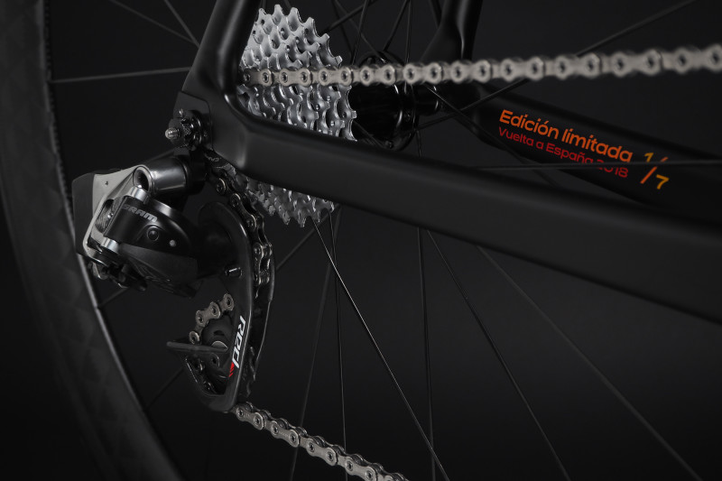 La Vuelta limited edition is red. It is symbolic for the race just like yellow goes with Tour de France and pink sticks to Giro d’Italia. Red is also the color most people would address to Spain with corrida bullfights in mind or the flaming Spanish hearts. Nowadays, red is the color of the winner’s jersey, but it used to be orange and yellow so these colors are portrayed on the frame.