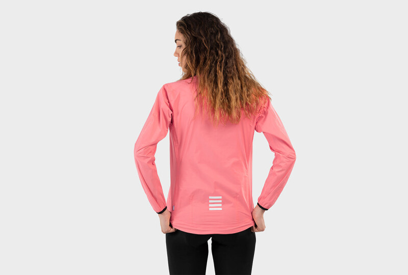 The front part is slightly shorter to avoid the bunching up of excess fabric due to the position on the bike, while the back features a drop tail, providing a few extra centimeters to protect you from splashing water. The length of the sleeves is specifically designed to ensure a snug fit and outstanding comfort during extreme effort. Underarm ventilation is achieved thanks to laser-cut perforations that dissipate heat guaranteeing impeccable breathability. Adjustable elastic drawcord at the hem allows you to find the right fit of the jacket so that it stays in place throughout the ride. It also includes a sealed, rubberized zipper with a storm flap and a zipper hut, as well as reflective detailing to improve visibility in low light conditions.