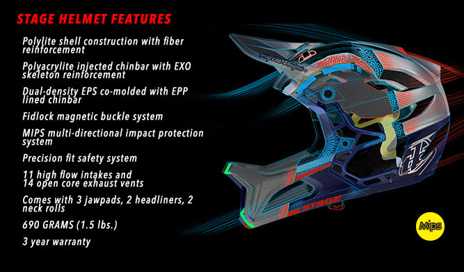 Troy Lee Designs (United States) - Press Release: The recently released Troy Lee Designs Stage enduro/trail helmet is turning heads & for good reason. Weighing in at just 690 grams the Stage helmet is equipped with all the bells & whistles including two headliner sizes, three pairs of jaw pads and two neck roll options to ensure a premium fit.
