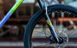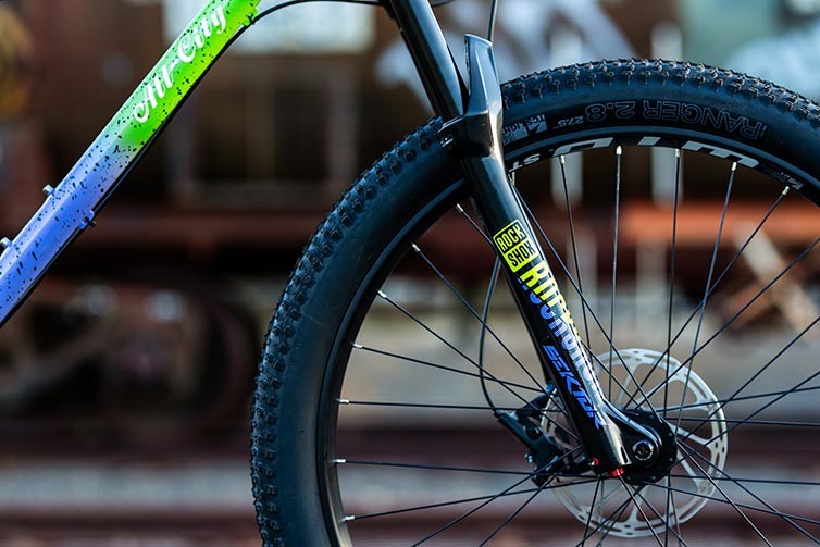 First, the three-color fade: Inspired by vintage MTBs, Lime leads the way on the front. Next, we’ve draped the middle in Violet and dipped the back in clean and classic Black. Black splatter paint across the steel frame makes the whole thing sing, and as a final touch, we’ve designed a matching decal for the fork. Dynamite with a laser beam!