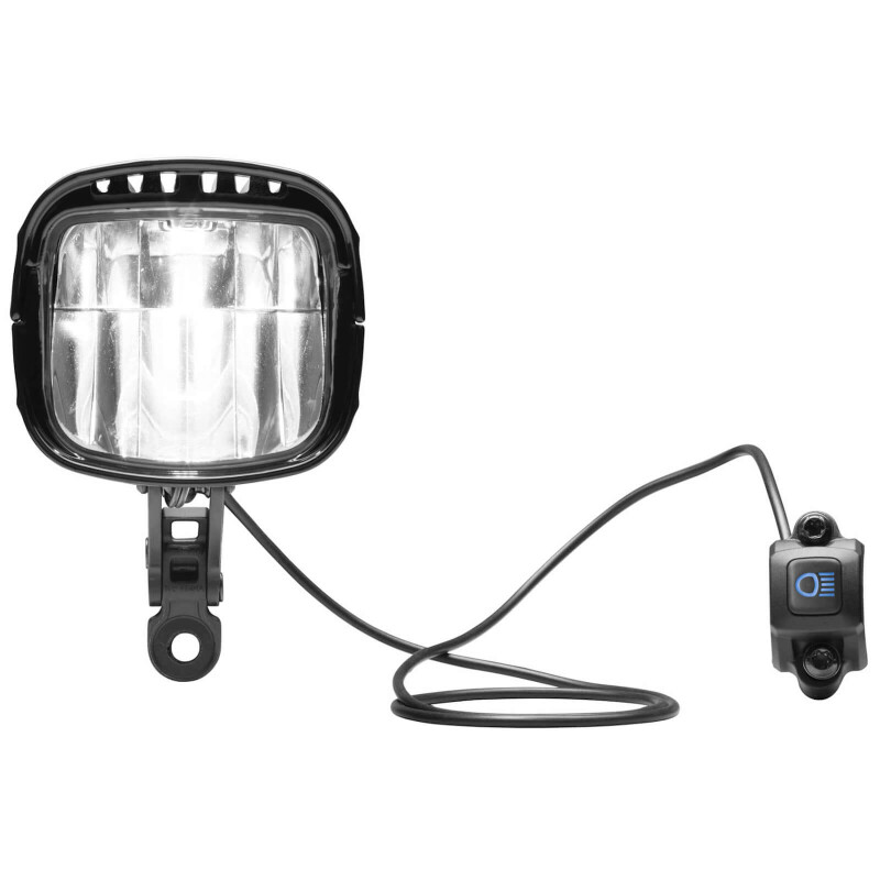 Sensor-controlled DRL ensures best visibility. High-grade black powder coating on an aluminium casing as well as a newly designed mounting bracket make the IQ-XL a design headlight for pedelec e-bikes. The handlebar button shines green in low beam and blue in high beam mode. It can be mounted on all handlebars or combined with suitable Magura and Tektro brake levers to save space.