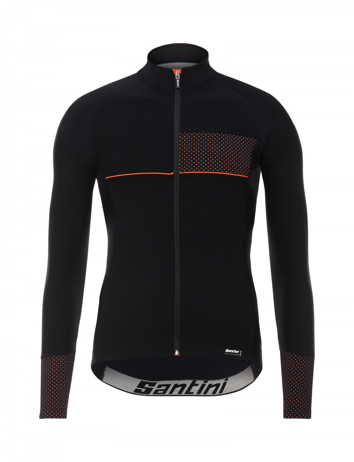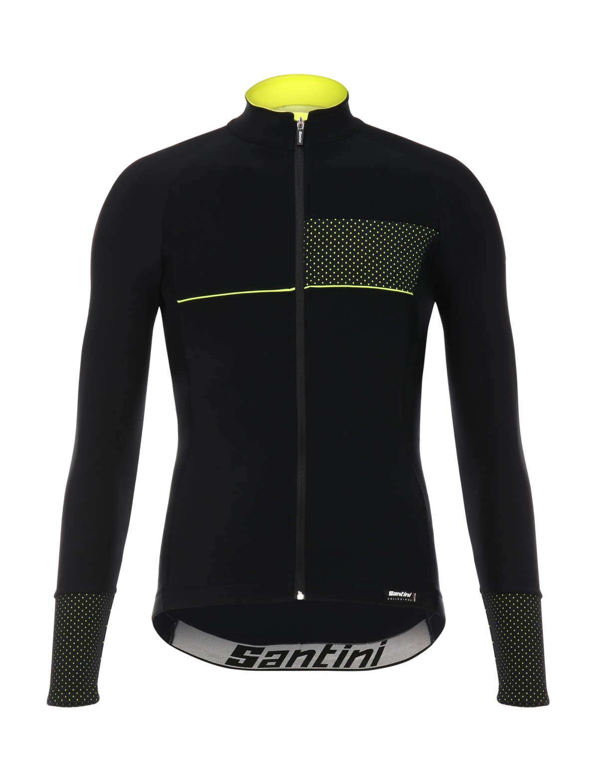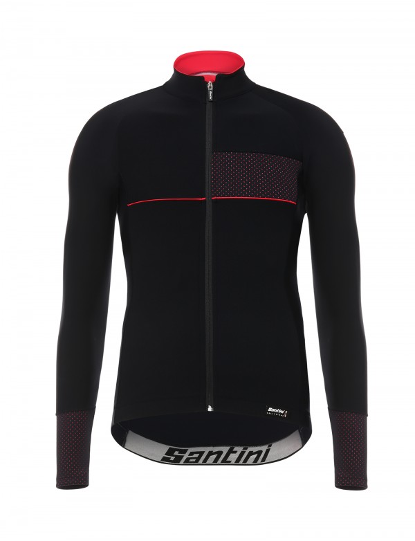 "Made of warm Blizzard thermofleece with water-resistant Acquazero treatment. Warm and comfortable it provides maximum protection from the rain. The jersey features a jacquard elastic waistband with a non-slip grip to ensure a perfect fit while you ride. Three large pockets on the back provide generous storage space", shared Santini.