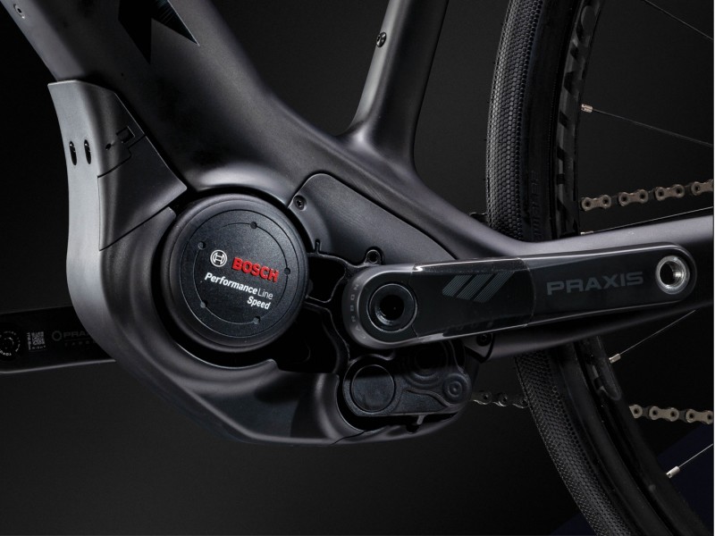 A lightweight 500 Series OCLV Carbon frame that fully encases a 500Wh battery, a powerful Bosch Performance Speed motor that helps you sustain speeds up to 28 mph, a Bosch Purion controller, a 1x11 SRAM Force 1 drivetrain, an alloy seatmast cap with integrated rear lighting, hydraulic disc brakes, and a kickstand.